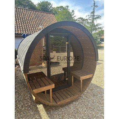 Produktinformation, Download im pdf-FormatRunde Außensauna mit kompletter Panoramafront, Harvia M3 Holzofen, LED-Beleuchtung und Glastür. Rückwand – komplett aus Holz für Privatsphäre.